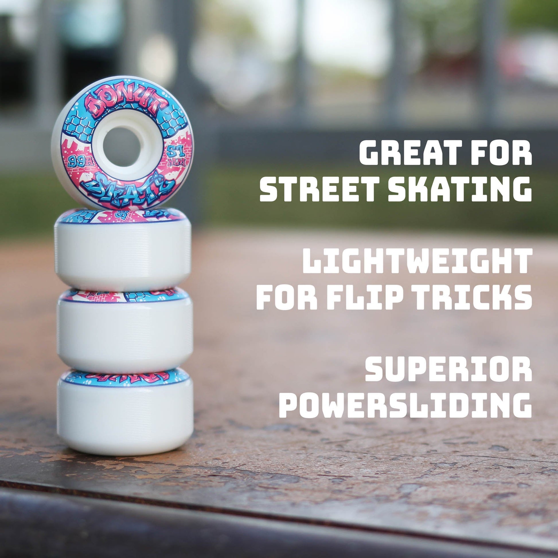 This set of 51mm - 99a skateboard wheels by Donut Skate Co is ideal for any situation. Go from street skating the roughest roads, to shredding rails at the skatepark. This is an everything wheel.